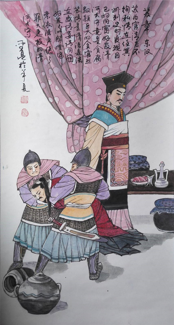 东汉刺史。苏章为官刚正廉洁,不徇私情。在任冀州刺史时,发现贪污受贿数额巨大的清河太守竟是自己情同手足的同窗好友。然苏章情归情,法是法,他在盛宴款待同窗好友后,依法办事,在公堂上将老同学拿下,依法将其治罪。?