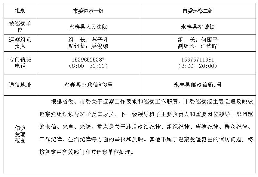 根据《中国共产党巡视工作条例》及中央、省委、市委关于巡察工作的部署要求,经市委巡察工作领导小组同意,从2017年12月中旬开始,启动十二届市委第四轮第一批巡察,对永春县人民法院、永春县桃城镇等2个单位开展巡察,巡察时间20天左右。日前,2个巡察组已进驻被巡察单位。